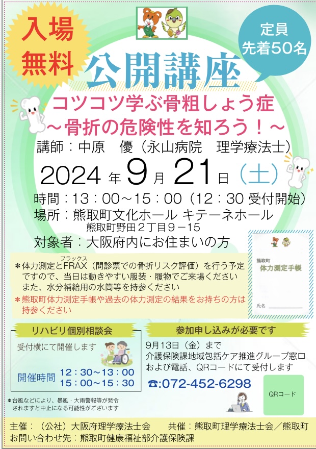 この度、2024年9月21日に(公社)大阪府理学療法士会を主催として、熊取町と本会の共催により、公開講座を開催いたします。熊取町の住民の皆様をはじめ、大阪府民を対象に大変多くの方にご参加いただければと存じます。