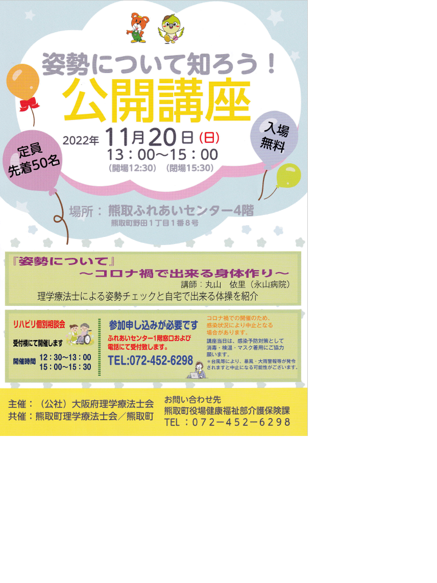 この度、2022年11月20日に(公社)大阪府理学療法士会を主催として、熊取町と本会の共催により、公開講座を開催いたします。熊取町の住民の皆様をはじめ、大阪府民を対象に大変多くの方にご参加いただければと存じます。
